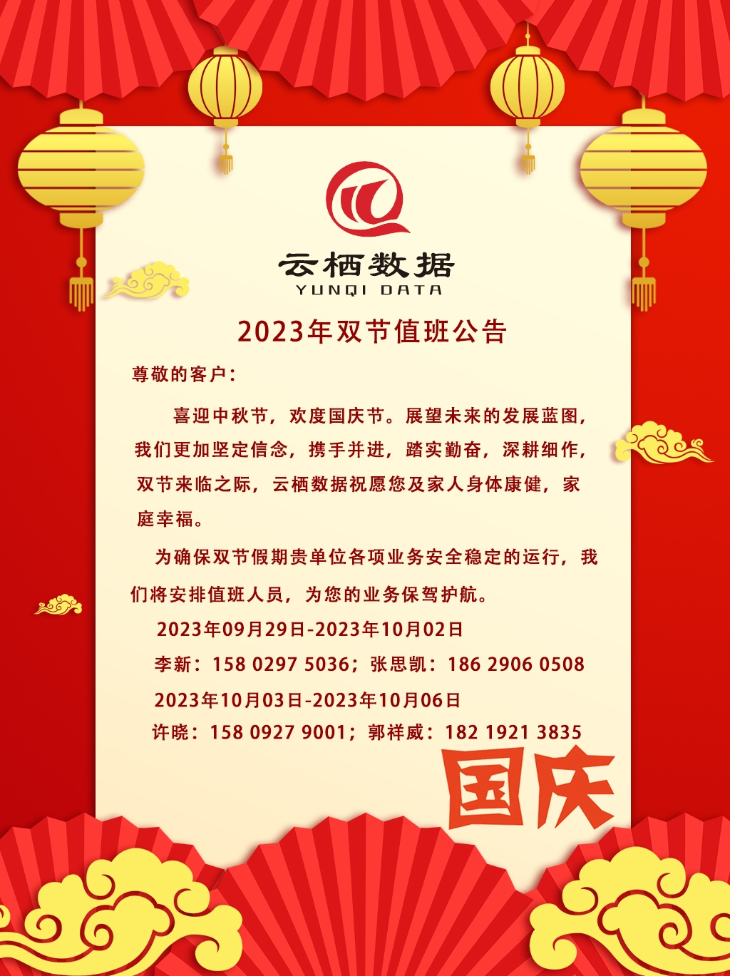 雲栖數據-2023年(nián)雙節值班公告
